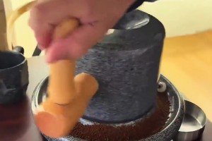大叔在家用石磨磨咖啡豆,研磨出来后,喝上一杯十分惬意